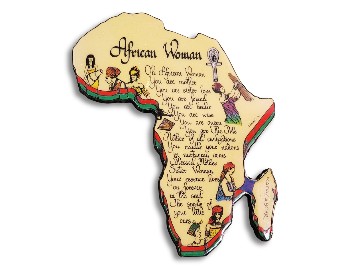 Shaped in the form of the African continent, this plaque features inspiring affirmations and illustrated representations of womanhood, motherhood, healing, and leadership. Each element reflects cultural pride, ancestral legacy, and spiritual identity.