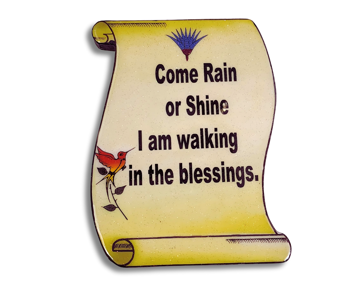 The “Come Rain or Shine, I Am Walking in the Blessings” Wall Plaque is a powerful statement of faith, resilience, and gratitude.